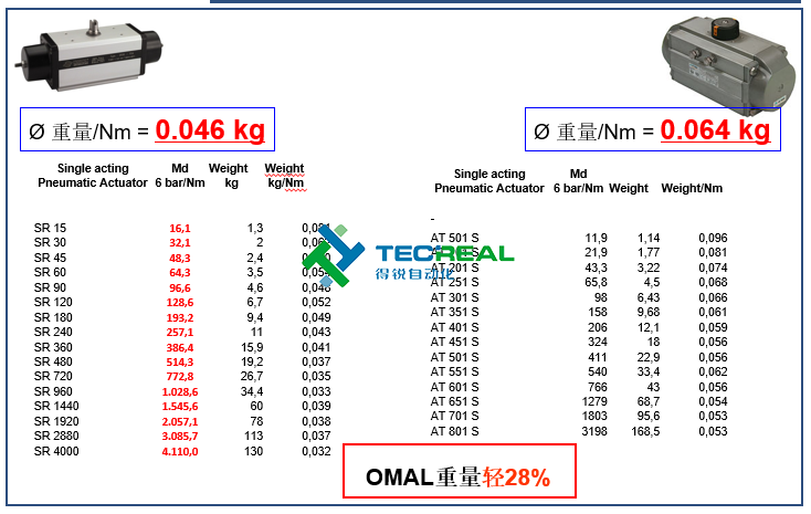 首先來(lái)看雙方的雙動(dòng)版本,從測(cè)試中可以看到OMAL的? 重量/Nm = 0.020 kg,而Air Torque執(zhí)行器? 重量/Nm = 0.032 kg。OMAL重量輕37%。