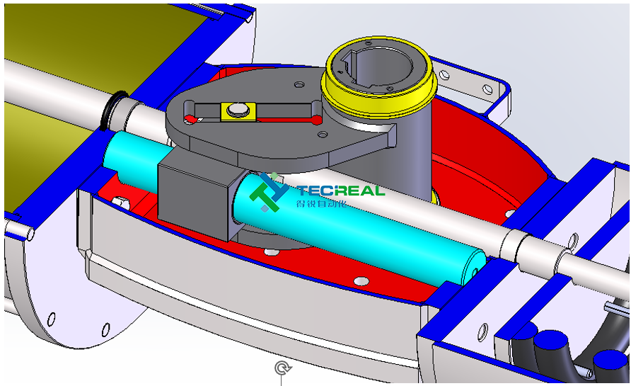這種執(zhí)行機構(gòu),撥叉是位于中央機構(gòu)控制活塞運動,但與氣缸活塞是分開的,這就解決了很多的密封問題,并且允許使用各種氣體或是液體控制,而不是只有空氣作為氣源.例如:水,氣體甲烷等。