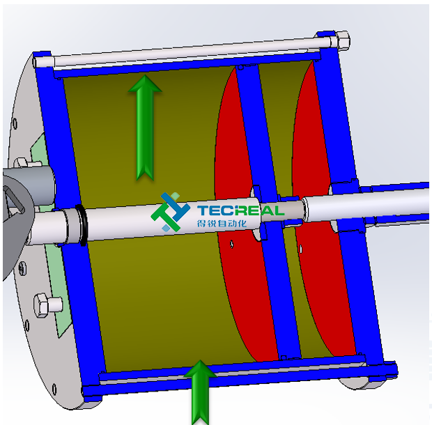 3.導(dǎo)桿(淺藍色)材質(zhì)為鋼(42Cr Mo4) 能夠承受高的側(cè)向力,確保足夠?qū)钊麠U的承受力。此外,導(dǎo)桿表面鍍鉻,以確保最大程度的防腐蝕性,減少與滑塊相互運動的摩擦阻力。