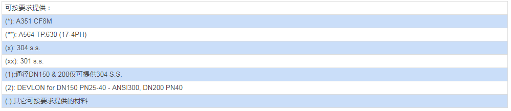 材料及等級(jí):對(duì)ANSI 美標(biāo)閥門,符合ASME B16.34 標(biāo)準(zhǔn);對(duì)PN 公稱壓力閥門,符合EN12516 標(biāo)準(zhǔn)