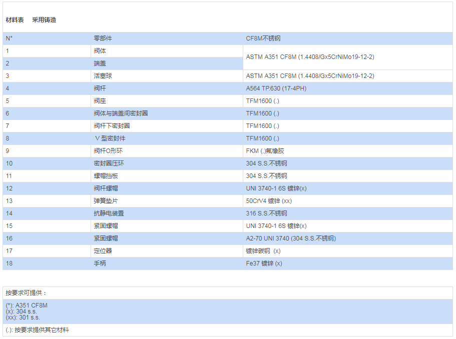 采用材料(用于閥體/活塞球/閥桿)與標準配置不同的參數(shù)要求,請與我們的銷售部門聯(lián)系