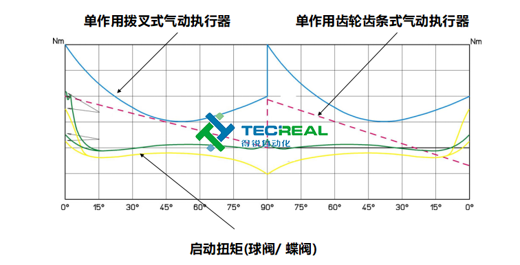 第三步,我們看兩者在輸出扭矩時的變化。圖1是撥叉式執(zhí)行器工作時扭矩變化圖,圖2位齒輪齒條式工作時扭矩變化圖。可以看到撥叉式氣動執(zhí)行器在開啟和關閉時扭矩蕞大,而齒輪齒條式輸出的扭矩則是一成不變的。學過物理的都知道,物體由靜止變?yōu)檫\動狀態(tài)時,需要克服的摩擦力蕞大,相應就要需要輸出蕞大的力。