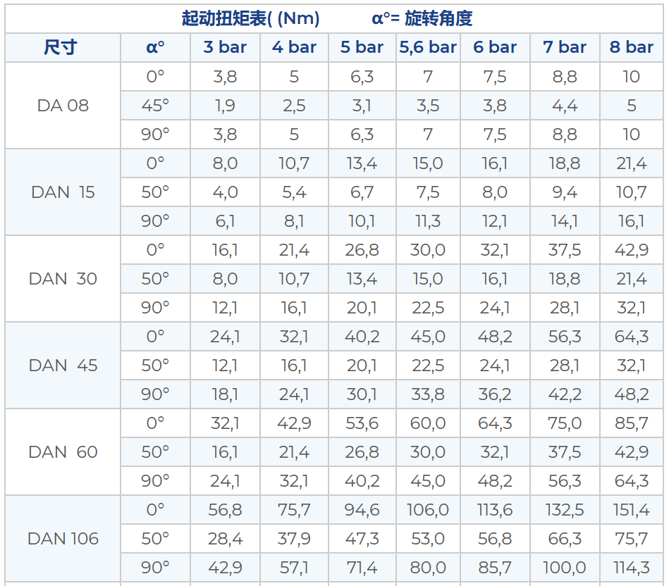 OMAL氣動執(zhí)行器的起動扭矩圖表