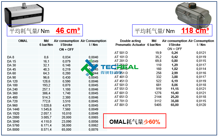 再看單動(dòng)型號(hào)的對(duì)比,OMAL的平均耗氣量/ Nm為58 cm3,Air Torque執(zhí)行器平均耗氣量/ Nm為120 cm3,從圖中可以看出OMAL的耗氣量比對(duì)方少51%。
