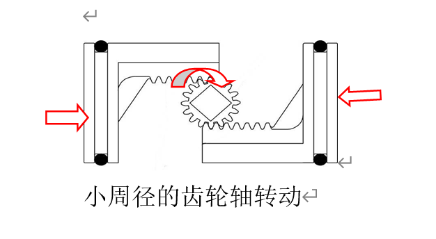 齒輪齒條式(多數(shù)廠家):齒輪與齒條因?yàn)橐獓Ш纤云浣Y(jié)構(gòu)為平行式結(jié)構(gòu),缸徑必須大于齒輪齒條分度圓之和,同時(shí),因?yàn)橐惺茌d荷沖擊,齒條厚度加大,因而結(jié)構(gòu)尺寸較大。